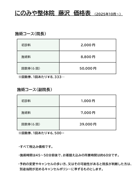 院長担当の施術料金は、副院長担当+1,800円かかりますし、予約が取りずらい状況が続いております。従いまして、重度の症状でない方は、副院長担当をお勧めしております。